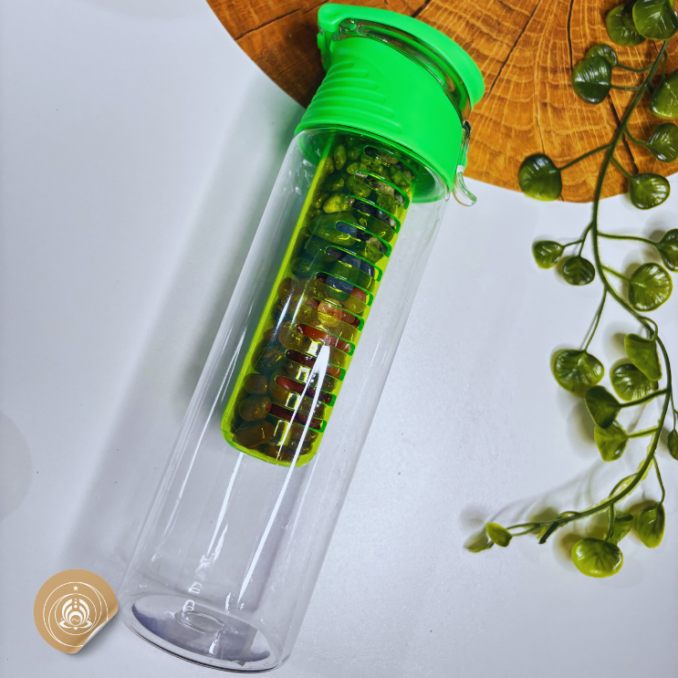 A Garrafa com Cristais e Infusor é uma poderosa combinação entre bem-estar físico e elevação energética. Com capacidade de 700 ml, ela é perfeita para o consumo de água energizada, águas saborizadas ou sucos, unindo praticidade, funcionalidade e o poder vibracional dos cristais jade nefrita, jaspe e cornalina.