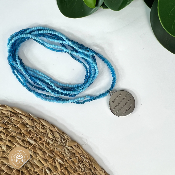 A Guia de Iemanjá é um colar consagrado à Rainha do Mar, Mãe das águas salgadas, guardiã da maternidade, da intuição e da limpeza espiritual. Feita com miçangas em tons de azul claro, fio duplo e pingente, essa guia canaliza a força do mar, a leveza emocional e o acolhimento do sagrado feminino.